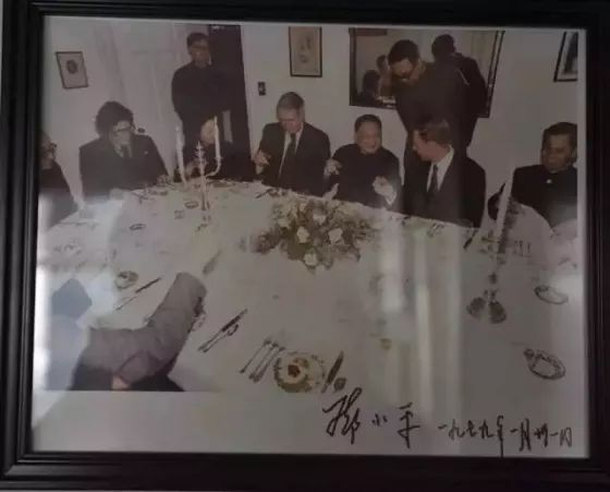 布热津斯基办公室墙上挂着一幅为中国领导人邓小平举行家宴的照片,照片上有邓小平的亲笔签名。