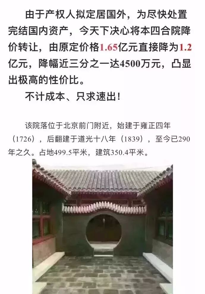 故事的主人公也就是卖房者,是一个北京四合院的业主。照理说,卖掉四合院也不算什么新鲜事儿。但最关键的是,业主表示,他愿意将四合院降价4500万贱卖,只为尽快获现移民。