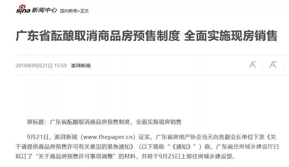 取消预售房改为现房销售 据澎湃新闻报道,广东省住房城乡建设厅已拟订了“关于商品房预售许可事项调整”的材料,并将于9月25曰上报住房城乡建设部。