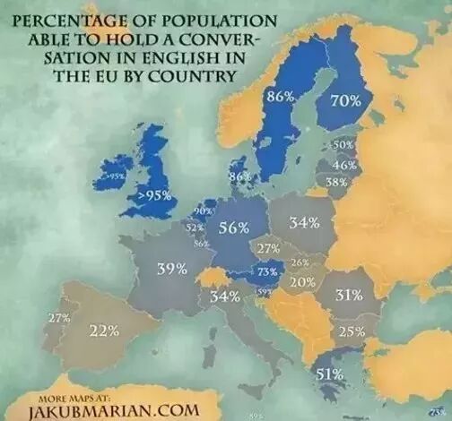 除了英国、爱尔兰、马耳他这些母语为英语的国家,排名第一的是荷兰90%,排名并列第二的是瑞典和丹麦86%。之后位居第三就是塞浦路斯73%,与奥地利比肩;德国56%;希腊51%;意大利34%;葡萄牙27%;匈牙利26%;西班牙22%。