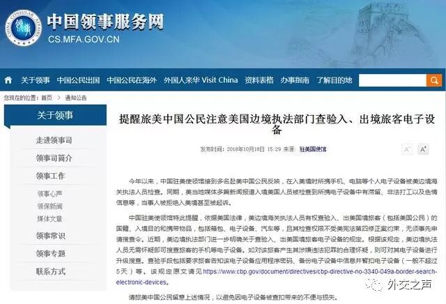 请旅美中国公民留意上述情况,以避免因电子设备被查扣带来的不便与损失。