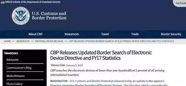 美国国土安全部曾经在网站公布:在边界加强搜查旅客电子设备新规定,以作为边境官员的执法依据。