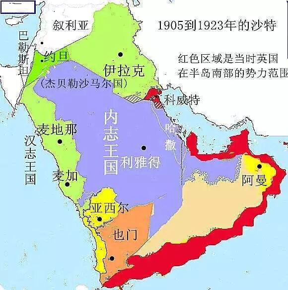 在大英帝国的支持下,伊本.沙特把世仇拉希德家族给灭了,沙特第三王国重新统一了内志,也被称为内志王国。