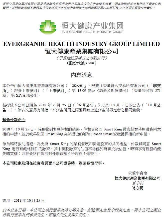 晚些时候,恒大健康发布《恒大健康产业集团有限公司内幕消息披露公告:紧急仲裁令》的公告:
