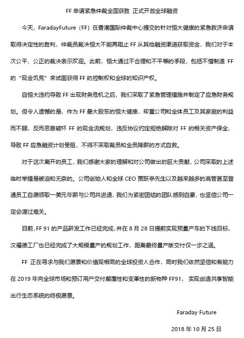 FF申请紧急仲裁全面获胜 正式开放全球融资 公告