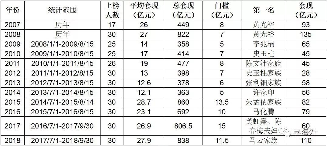 《2018胡润套现企业家30强》上榜门槛从去年的15亿下降到11.5亿。榜单中套现数额主要是从2017年7月1日至2018年9月30日的数字。