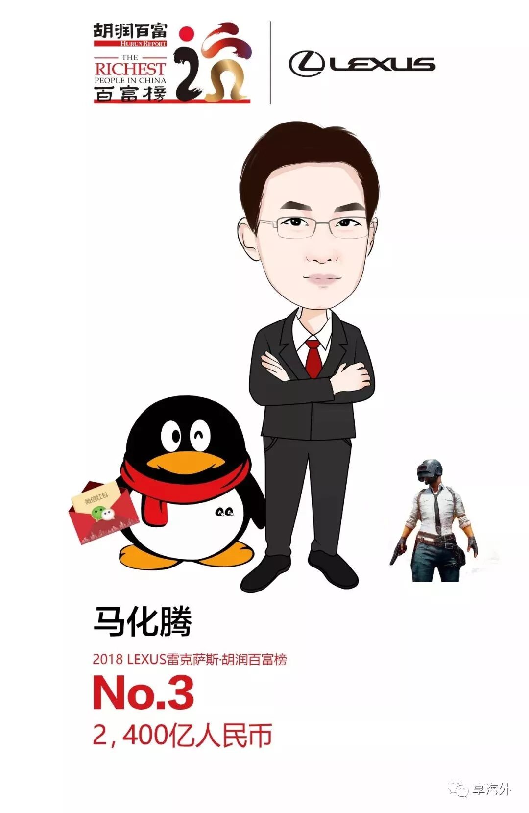 去年10月,马化腾通过减持所持有的香港上市公司腾讯公司股票及过去一年腾讯股票分红累计套现24亿元。马化腾以财富2400亿元位列《2018 LEXUS雷克萨斯•胡润百富榜》第三位。