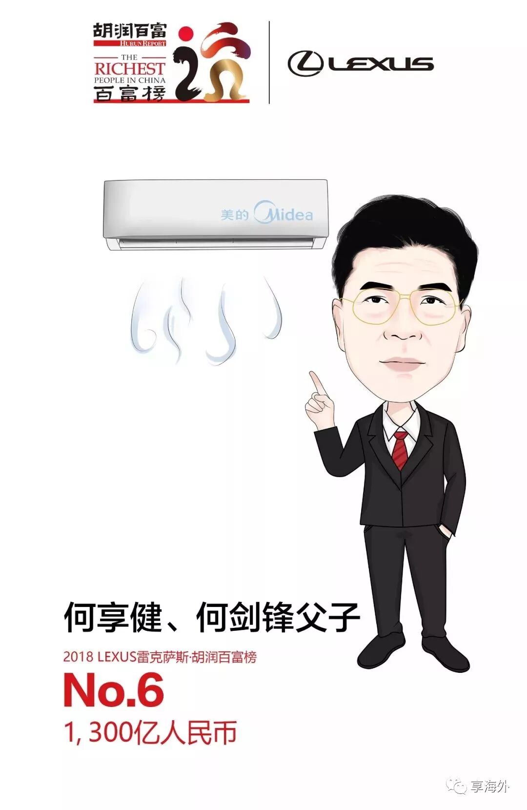 今年5月,何享健、何剑锋父子通过所持有的A股上市公司美的集团股份获得分红25亿元。何享健、何剑锋父子以财富1300亿元位列《2018 LEXUS雷克萨斯•胡润百富榜》第六位。