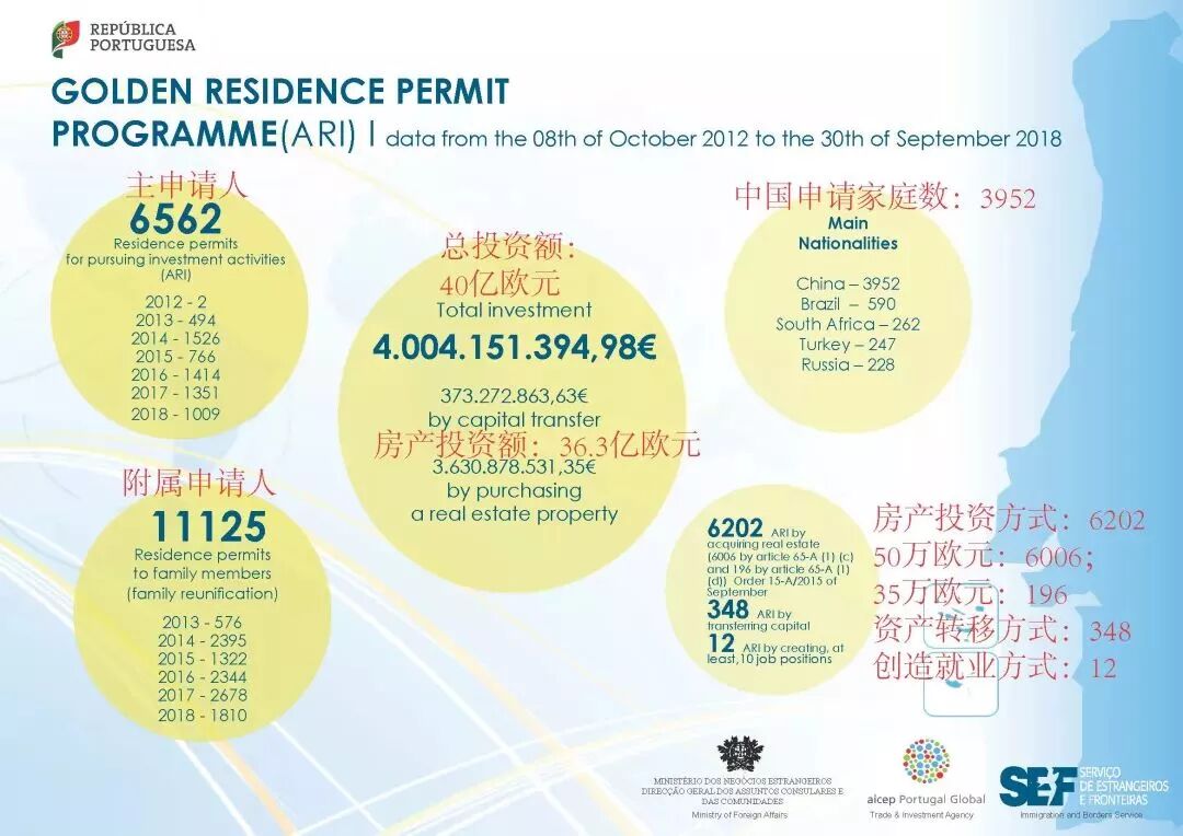 葡萄牙黄金居留许可计划(Golden Visa)截至9月底的大数据显示,该政策已经累计为葡萄牙政府吸引超过40亿欧元的投资资金,有超过6500个家庭通过该计划获得了身份,家庭成员的获批人数超过11000人。