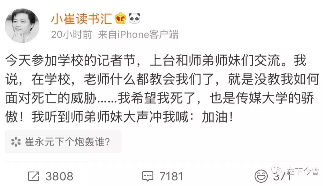 拥有15万粉丝的公号“在下今曾”称崔永元的敌人:是“一坨周围满是苍蝇又冒着热气的屎。”