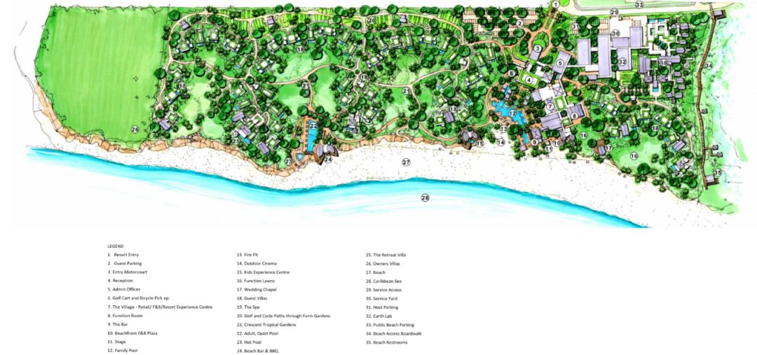 酒店坐落在甘蔗园种植园的旧址上,缓缓的山丘一直延伸到美丽的银灰色沙滩上,规划建设的70套带独立泳池的别墅均会面朝加勒比海,让宾客可以享受到无限海景、感受到与世隔绝的宁静。