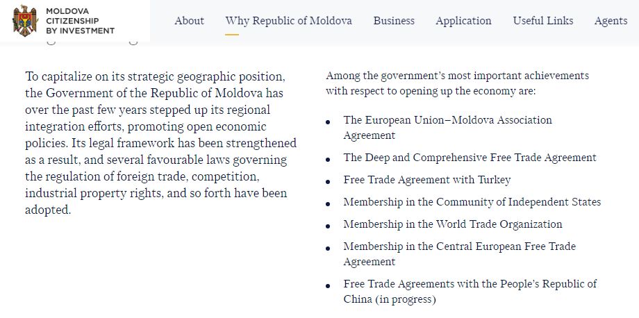 在2018年11月摩尔多瓦投资入籍项目在迪拜召开的“第十二届全球居留权和公民权年会”上宣布正式开始接受全球范围内的申请。 摩尔多瓦作为首个欧洲大陆国家护照项目,也是目前最便宜的欧洲护照,最低投资额仅10万欧元即可三代移民欧洲,堪称2018年的明星护照产品。 该项目是摩尔多瓦政府根据2000年6月颁布的NO.1024-XIV《摩尔多瓦公民法》,并于2018年颁布最新修改的《摩尔多瓦投资入籍条例》实施的。 摩尔多瓦投资入籍官网:http://www.cbi.gov.md/ 摩尔多瓦护照优势 首个欧洲大陆护照项目,而且是最便宜的欧洲护照项目 花费仅相当于加勒比岛国护照的价钱,但拿到的是一本欧洲大陆国家的护照,以往的投资入籍项目多是岛国,国土面积小人口少,从经商和居住考虑摩尔多瓦更有优势,摩尔多瓦的国土面积是3.38万平方公里,人口356万,这样的国土面积和人口数量才可以构成客户在海外建立第二家园的基础。作为一个欧洲大陆国家,摩尔多瓦的单人投资额是10万欧元,全家五口以及以上的投资额也仅15.5万欧元。 护照产品中国家发展潜力最高的项目 和其他旅游度假国家的护照项目不同,摩尔多瓦是具备极大的经济发展潜力的,购买摩尔多瓦护照不仅仅是为了身份规划,还可以做事业规划和投资规划。摩尔多瓦不但经济发展迅速,农业和葡萄酒业世界闻名,而且地理位置很优越,面向欧洲,免签俄罗斯,同时还是美国E-2签证的缔约国,一本护照相当于打开了三个地区的市场。摩尔多瓦一直以融入欧洲为发展目标,除了递交欧盟申请还签订了一系列融入欧洲的贸易协定。如《独联体自由贸易协定》、《东南欧稳定公约》、《同欧盟的贸易关税普惠》、《同欧盟的自主贸易优惠》、《同欧盟的深度广泛自贸区》、《摩尔多瓦土耳其自由贸易协定》等,在东南欧和独联体国家均享受贸易优惠待遇,现在投资相当于低价投资一本欧盟护照。 摩尔多瓦投资入籍项目在目前所有的护照项目中性价比属于高的,在经济发展活力、地理位置,以及国家潜力上都极具竞争力,免签121个国家,包括申根国和俄罗斯,美国E-2签证缔约国,也是一带一路成员国之一,高性价比是这本护照备受追崇的主要原因。