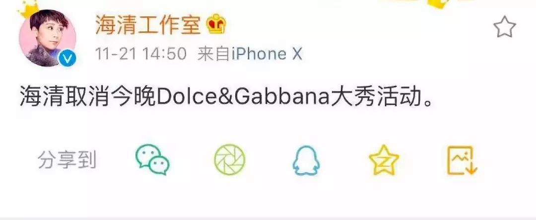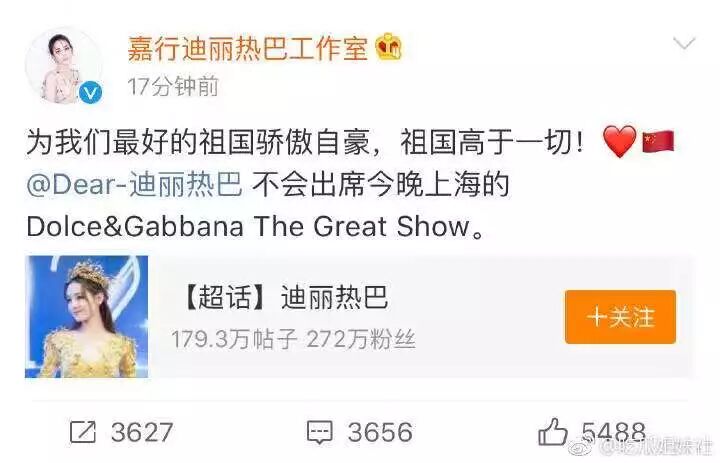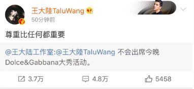 随着D&G设计师发表辱华言论事件的曝光,许多今晚被邀请参加大秀的中国艺人也纷纷选择退出——