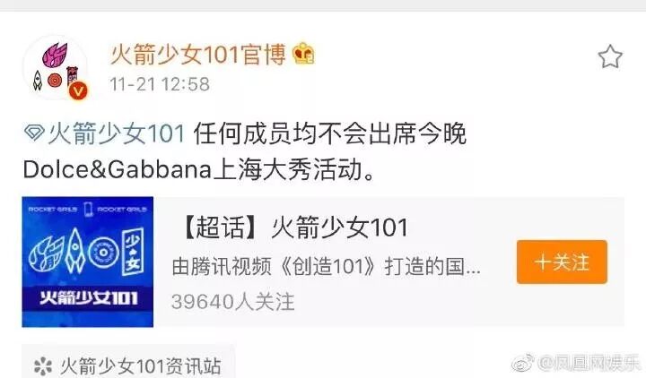 火箭少女101的官方微博表态称:火箭少女101的任何成员都不会出席今晚D&G的上海大秀。