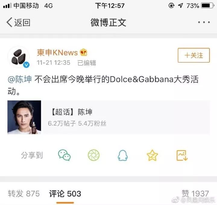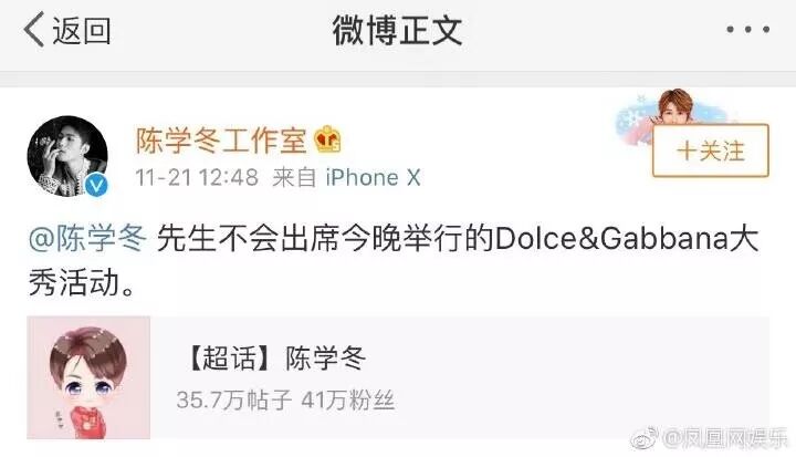 有粉丝称,陈坤原本已经抵达上海,但是看到D&G设计师辱华的新闻后,直接扭头飞回北京了……