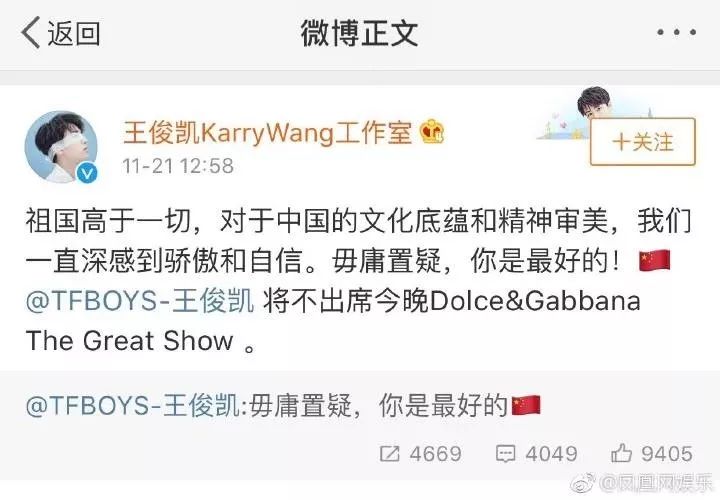 随后工作室也转发称,祖国高于一切,王俊凯将不出席今晚D&G的大秀。