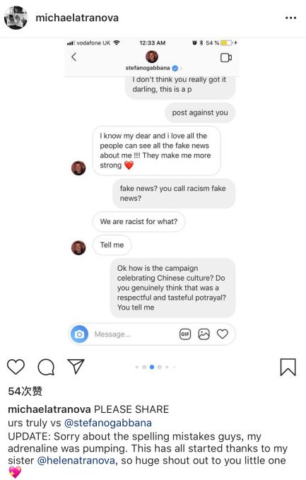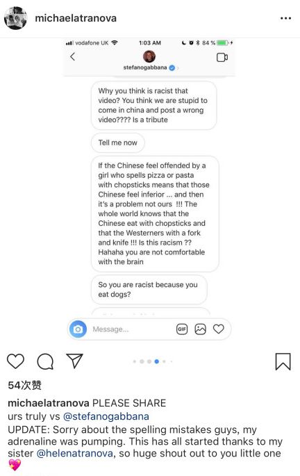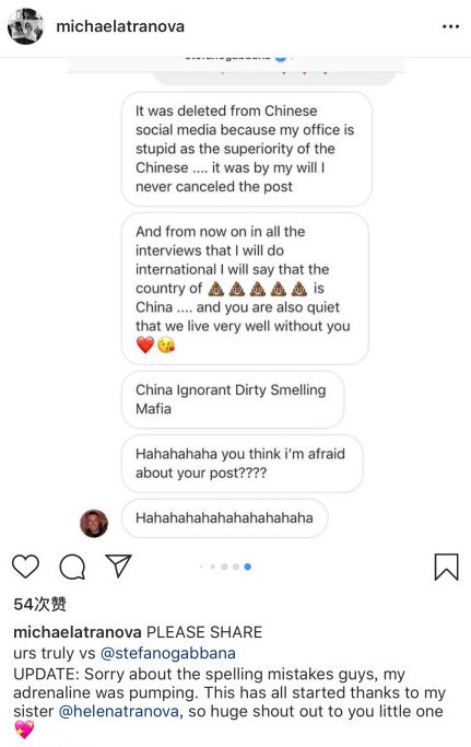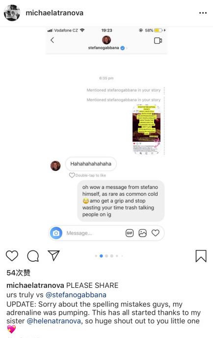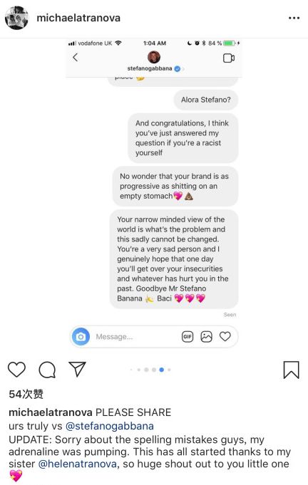 今天,有网友爆出和Dolce&Gabbana设计师Stefano Gabbana在Instagram上的一段真实的对话: