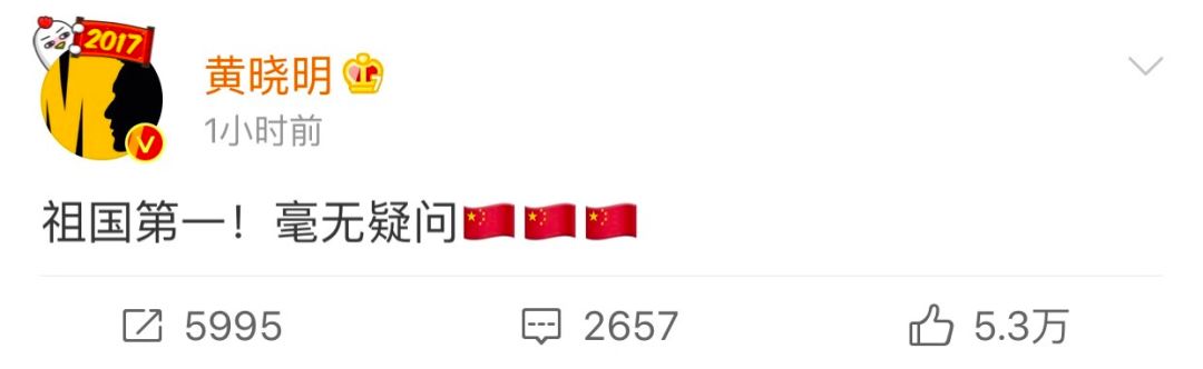 李冰冰则是直接发微博表示:我爱我的祖国。