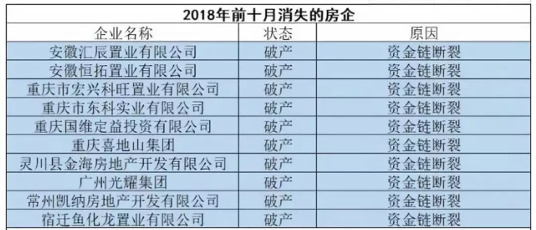 2018年前10月,已有10家房企因资金链断裂宣告破产。