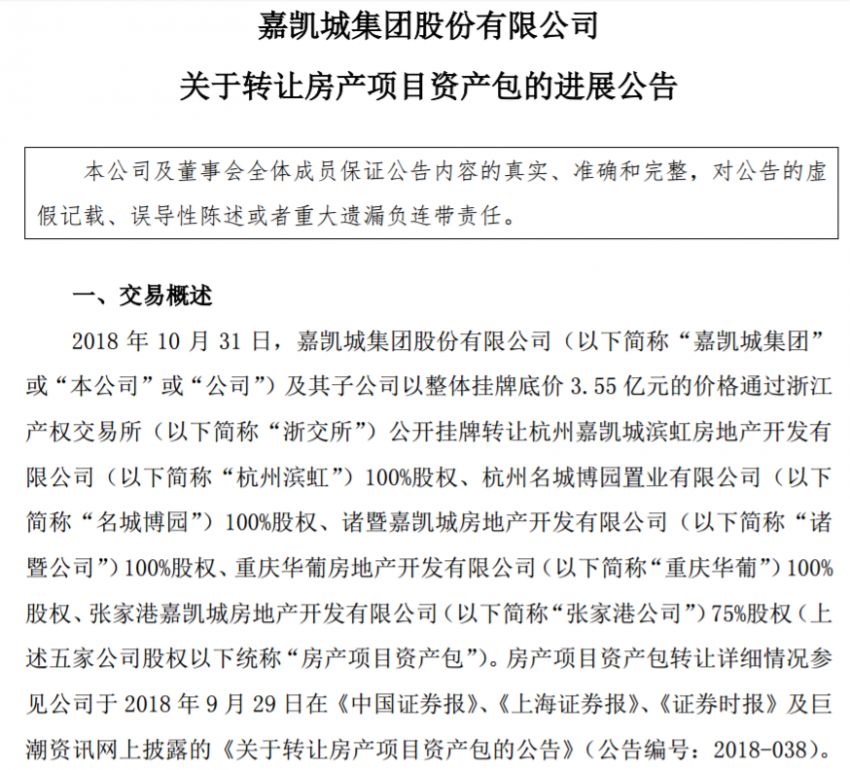 11月9日,嘉凯城集团股份有限公司发布转让房产项目资产包进展公告。杭州锦蓝置业有限公司以3.55亿元竞得嘉凯城在浙江产权交易所所有挂牌资产。