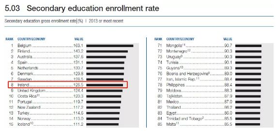Èç´Ë¾Þ´óµÄÕþ¸®½ÌÓýÖ§³ö£¬Ïà¶ÔÓ¦µÄÊǼ«¸ßµÄ½ÌÓýÆÕ¼°ÂÊ¡£¸ù¾ÝÊÀ½ç¾¼Ã·å»á2016Äêµ÷²éÊý¾ÝÏÔʾ£¬°®¶ûÀ¼ÖÐѧ½ÌÓýëÈëѧÂʸߴï126.5%£¨´ËÊý´óÓÚ100%±íÃ÷ÿÄêÓкܶà·Ç°®¶ûÀ¼³£×¡¾ÓÃñÑ¡ÔñÔÚ°®¶ûÀ¼½ÓÊܽÌÓý£©£¬ÅÅÃûÈ«ÇòµÚ°Ëλ¡£