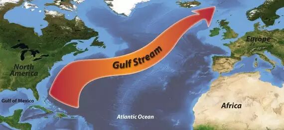 因为墨西哥湾暖流是地球上最大的海洋洋流,雨水量是其它河流的总和40倍,导致英伦半岛和欧洲气温上升和水量充沛。