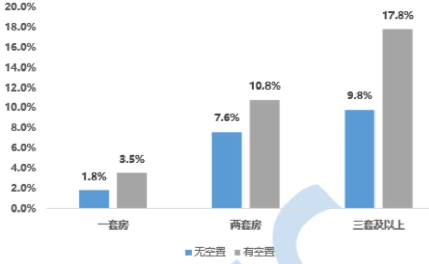 图片来源:图虫创意 随着我国住房拥有率的逐年提升,住房空置率也逐年增加。研究机构的报告显示,中国住房空置率为21.5%,仅低于西班牙和意大利,高过全球多数国家。而这些空置住房占用了超过10万亿元的信贷资源,既浪费了贷款资源,也蕴含了金融风险。在房价下跌时,若大量空置住房集中入市,必然对住房市场造成冲击。 图为:各国空置率数据汇总(来源:CHFS) 对此,业内专家指出,我国自有住房空置率较高的重要原因可能是中国家庭持有多套房的成本相比于其他国家要低很多,因此建议对空置住房直接征收空置税来降低空置率,提高住房使用效率。此外,规范完善租房市场,完善房屋信息公开机制,构建房屋大数据信息系统都有助于盘活住房存量,促进空置住房资源的有效利用。 值得注意的是,从各国空置税实践经验看,空置税是建立在房产税基础上的,而刚刚闭幕的中央经济会议在明年的重点工作任务中提出,“要推进财税体制改革,健全地方税体系”,明年是否出台房地产税值得关注。 西南财经大学中国家庭金融调查(CHFS)与研究中心的最新报告显示,根据2017 年中国家庭金融调查的数据,我城镇家庭住房拥有率为 90.2%,其中,城镇家庭多套房住房拥有率为22.1%,而城镇地区住房空置为21.4%。据估算,2017 年,我国城镇住宅市场空置的住房数量总数为 6500 万套。 分区域看,当前我国二线和三线城市空置情况更为严峻,空置率明显高于一线城市。数据显示,2017 年二线城市、三线城市空置率分别高达 22.2%和21.8%,远高于一线城市的 16.8%。从变化趋势来看,2015-2017 年间二线城市空置率大幅上升,三线城市空置率略有上涨,一线城市住房空置持续下降。数据同时显示,商品房的空置率在所有住房类型中位居第一,且呈持续上升趋势,达 26.6%。 图为:一、二、三线城市空置率(CHFS) 对于二线城市空置率增长速度超过三线城市、以及一线城市空置率下降的原因,中国家庭金融调查(CHFS)与研究中心主任甘犁指出,2015-2017 年间,二三线城市商品住宅销售均大幅度上涨,但是三线城市由于棚改加速,拆迁比例明显高于二线城市,所以二线城市空置率增长速度超过三线城市。而一线城市空置率下降是因为新增住房与人口增长基本相当,但是仍然存在 1.4%的家庭被拆迁。 值得注意的是,一线城市户籍家庭一线城市购房比例逐年下降,二三线城市购房比例上涨。甘犁认为,这一方面源于二三线城市建设对于一线城市户籍家庭的吸引,另一方面也反映出一线城市住房价格过高对于其家庭购房的挤出。 “综上,即使存在一线城市户籍家庭跨线购房的行为,但考虑到其家庭基数较小,三线城市购房区域升级的行为将进一步加剧三线城市住房过剩的情况。”甘犁说。 空置住房占用了大量的住房贷款,与无空置住房的家庭相比,有空置住房的家庭有更高比例的住房负债,同时,未偿抵押贷款的平均水平和增长速度更高。 CHFS最新数据显示,2013 年至 2017 年,无空置住房的家庭平均未偿抵押贷款增长率为 8.4%,从 23.7万元增长到 25.7 万元。而有空置住房的家庭未偿抵押贷款增长了25%,从 32 万元增长到 40 万元。截至 2017 年底,全国住房抵押贷款总余额达到 22.9 万亿元,相当于 2018 年国内生产总值的 27.9%。据估算,2017 年,有空置住房的家庭未偿抵押贷款占抵押贷款总额的47.1%,预计规模为 10.3 万亿元。 图为:住房贷款未偿余额比较(来源:CHFS) 甘犁指出,空置住房占用了大量的住房贷款,既浪费了贷款资源,也蕴含了金融风险。与此同时,在市场出现波动的情况下,若大量空置住房集中入市,必然对住房市场造成冲击。 CHFS数据显示,在当前房价下,现值低于购买成本的空置住房比例为 5.6%,略高于非空置住房比例的 5%。如果房价下跌 5%,空置住房遭受损失的比例将加速上升到 12.2%,而非空置住房遭受损失的比例仅上升到 7.8%。如果房价继续下跌,遭受损失的空置住房比例将会加速攀升,明显高于非空置住房遭受损失的比例。随着房价下跌 50%,约 42.3%的空置住房将遭受损失,比非空置住房遭受损失的比例高出近14.7 个百分点。 图为:房价下跌不同程度房产价值受损比例(来源:CHFS) 甘犁还指出,当房价下跌幅度小于 20%时,空置住房资不抵债比例接近于非空置住房的比例,最高不超过6.7%,情况不是特别严重。然而,当房价下跌超过 20%时,住房资不抵债的比例会迅速上升,空置住房的上升速度也会比非空置住房更快。当房价下跌 30%时,空置住房和非空置住房的资不抵债比例将分别上升到 13.6%和 10.7%。随着房价下跌 40%,空置住房和非空置住房资不抵债的比例将加速上升到 23.5%和 18.7%。 图为:房价下跌不同程度房产资不抵债比例(来源:CHFS) 值得注意的是,2013-2015 年间住房价格下调期间,拥有三套及以上住房的空置住房家庭出售住房的比例是非空住房家庭的近乎两倍,对市场造成的下行压力更大。 图为:家庭 2013 年住房空置情况与 2013-2015 年间售房比例(来源:CHFS) 对于我国自有住房空置率较高的原因,甘犁认为,与其他国家相比,中国家庭持有多套房的成本很低,这可能是我国自有住房空置率较高重要原因。我国在房地产保有环节的税种仅有房产税和城镇土地使用税,其免税范围大,私人住房一般无需缴税。国际现行房地产在保有环节的征税体系中,主要包括不动产税,财产税等,其税收水平为房产价值的 1%-3%。 CHFS通过分析美国房地产市场 2010-2017年的城